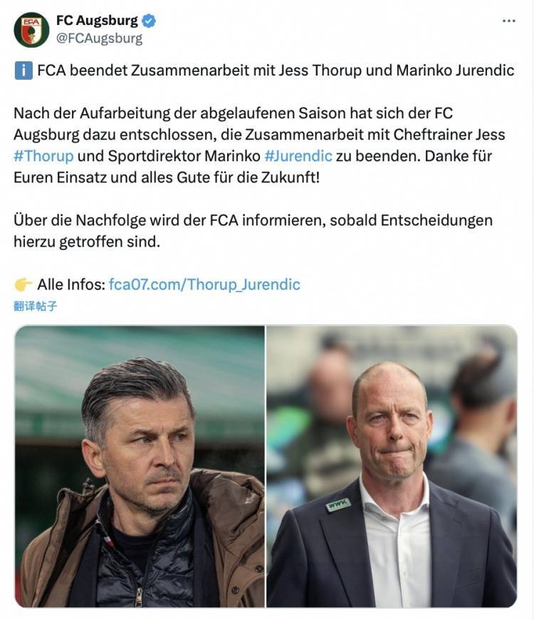 奥格斯堡官方表示,在对刚刚结束的赛季进行总结之后,俱乐部决定与主教练索鲁普和体育总监尤伦迪奇结束合作关系,同时俱乐部感谢两人的付出,并祝愿他们未来一切顺利。