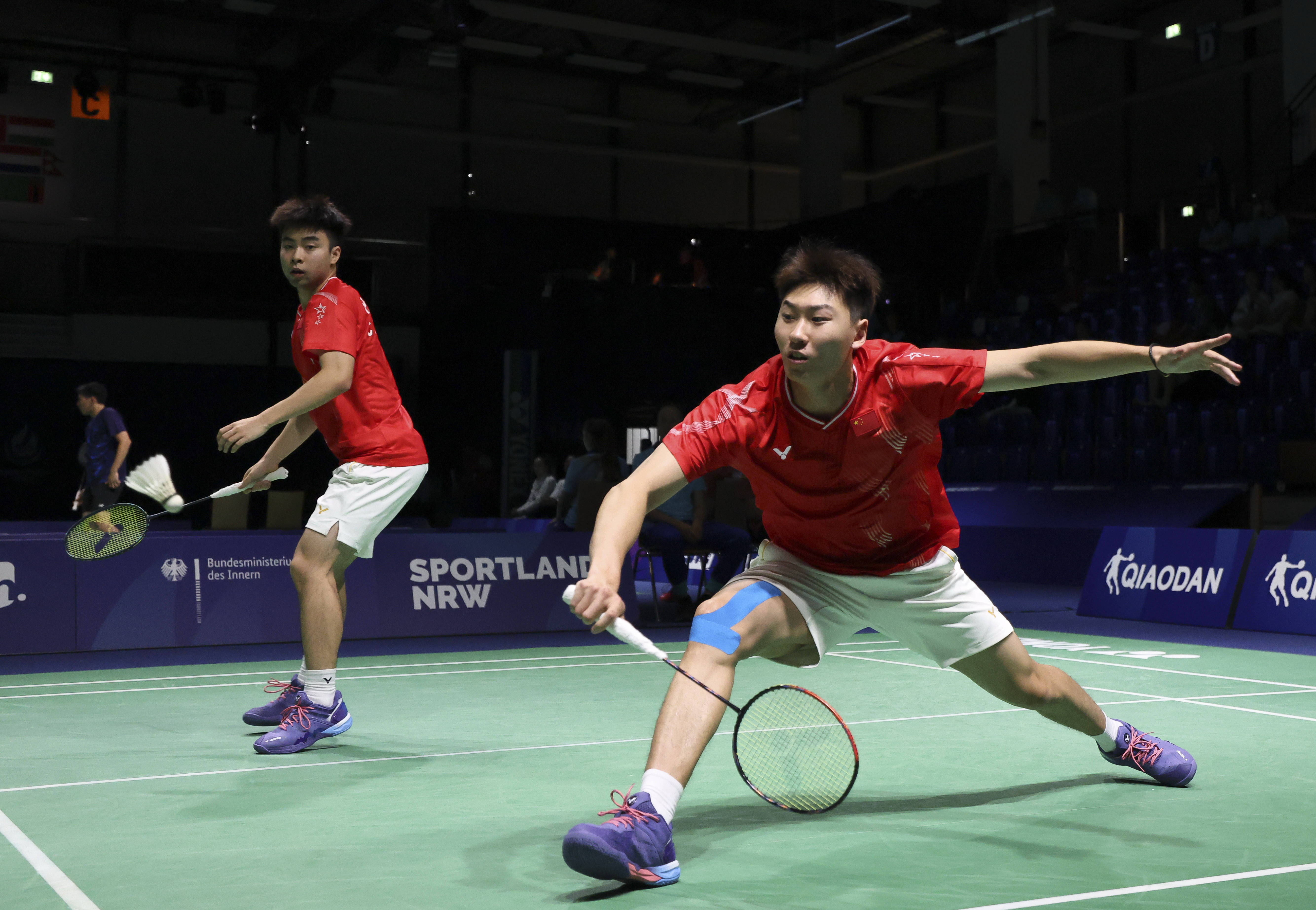 7月18日,中国队组合崔赫宸(右)/彭建钦在男双比赛中。 新华社记者 胡星宇 摄