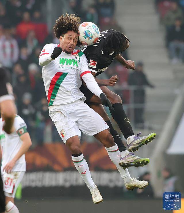↑1月31日,奥格斯堡队球员马桑戈(左)和圣保利队球员琼斯在比赛中争顶头球。